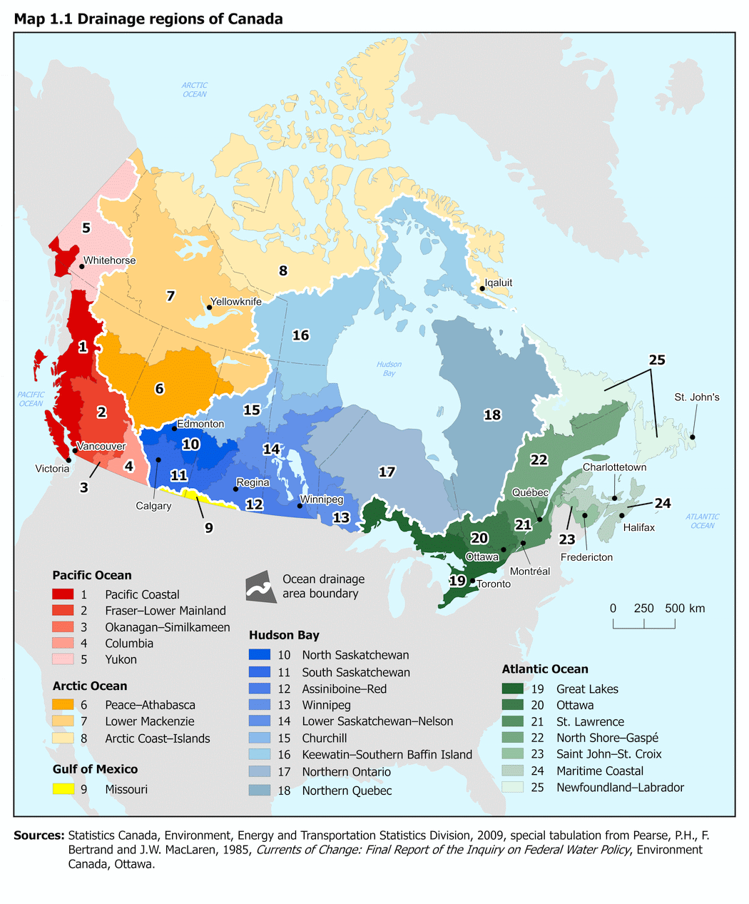 Cette carte montre la moyenne historique de l’équivalent en eau de la neige (EES) à travers le Canada. L'EES est la quantité d'eau que libérerait un volume donné de neige s'il fondait. L’EES de l'enneigement hivernal est important pour les ressources en eau douce, car au printemps, lorsque les températures augmentent, la neige accumulée durant l'hiver dans les montagnes commence à fondre, s'écoulant vers les pentes et pénétrant dans les sols. Cette eau de fonte est une contribution majeure aux rivières et aux réservoirs souterrains, qui sont largement utilisés par les écosystèmes et les humains pour leurs activités et leur survie.